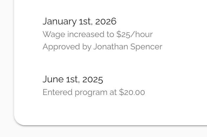Set up wage progression schedules that match your registered program's requirements exactly. Define increase intervals by hours completed, time elapsed, or competency milestones — however your standards dictate. Each occupation gets its own schedule, so every apprentice is on the right pay trajectory from day one.